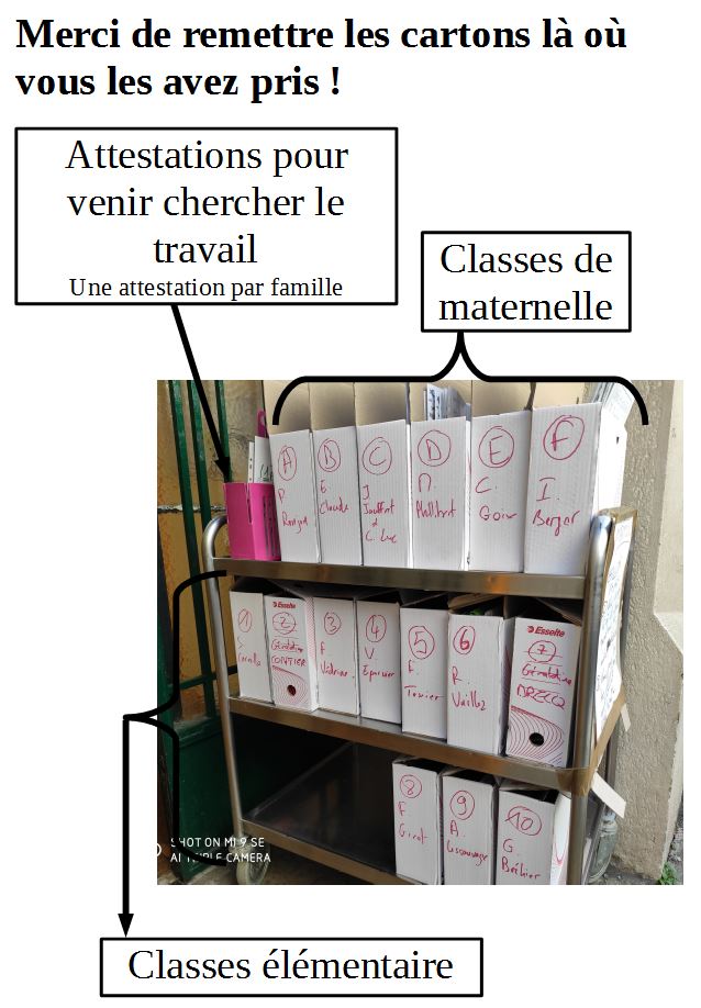 Pour venir à l’école chercher le travail proposé par les enseignantes et enseignants, vous devez vous munir de l’attestation (document de droite) qui est à compléter. Un exemplaire papier est à disposition sur le chariot devant la maternelle.
