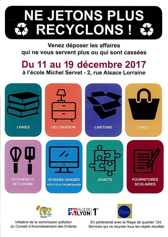 Déc 14 2017 Je recycle, tu recycles, nous recyclons… Posted by BARBIER Pascal Vous pouvez déposer vos affaires devant l’école élémentaire dans les poubelles prévues à cet effet. Cette action est menée par le conseil d’arrondissement des enfants. Merci de votre participation.