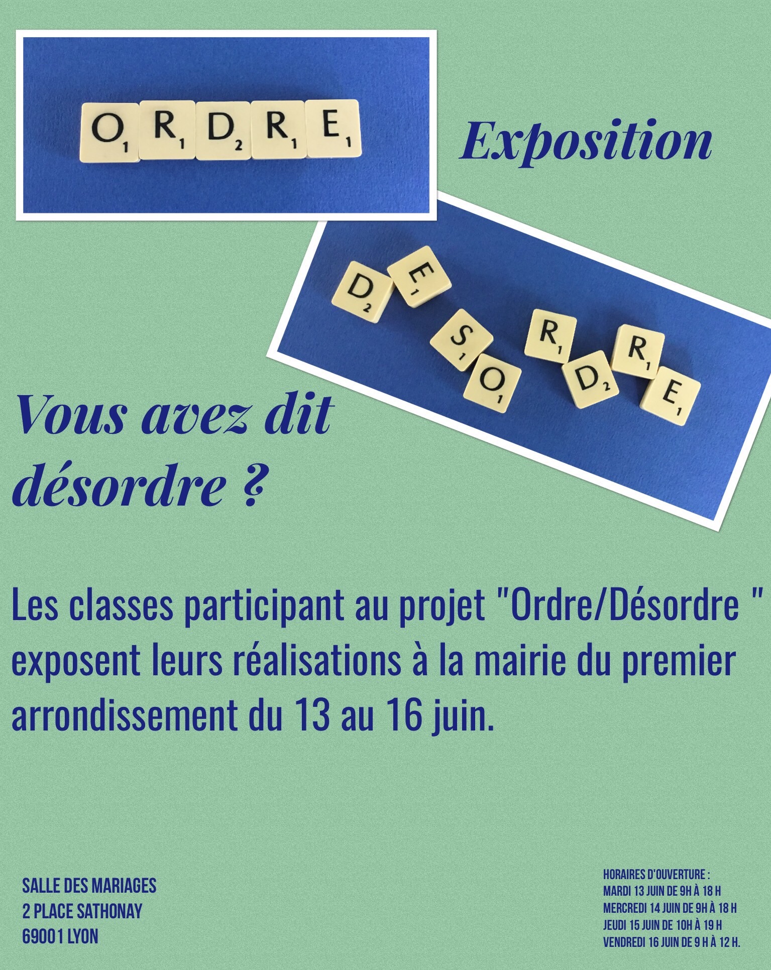 Juin 09 2017 Ordres & désordres Posted by BARBIER Pascal Les classes exposent entre le 13 et le 16 juin salle des mariage, mairie du 1er Le vernissage aura lieu : le 14 juin à 12h00. Nous vous attendons nombreux !