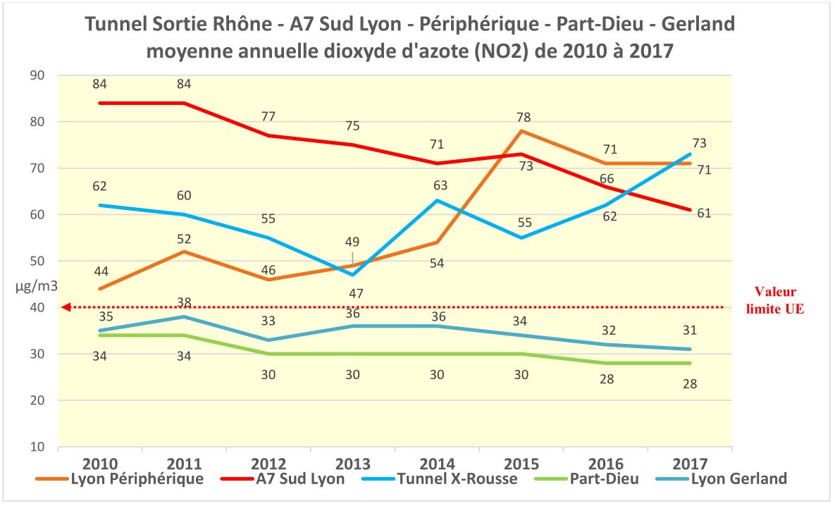 L’évolution de la moyenne annuelle en dioxyde d’azote (NO2) de 2010 à 2017 au abord du tunnel de la Croix Rousse est préoccupante.
