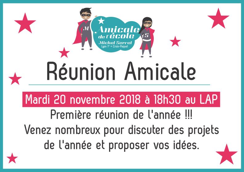Nov 16 2018 Réunion Amicale des parents Posted by BARBIER Pascal Vous êtes attendus mardi 20 novembre 2018 à 18h30 au LAP pour la première réunion de l’Amicale des parents de l’école Michel Servet.